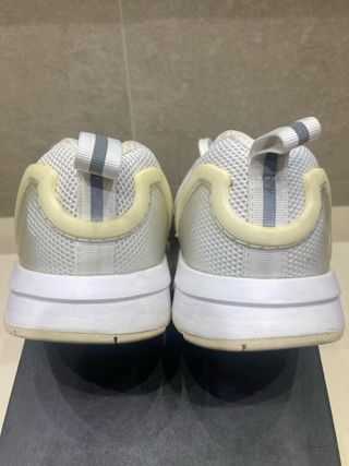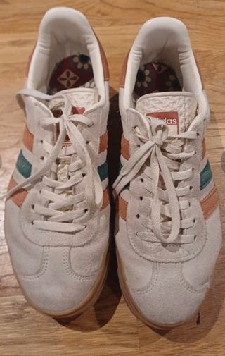 Muy poco uso, están muy bien tanto por fuera como por dentro. Color beige claro con detalles en blanco y talón en azul, bastante combinables para el día a día. Suela color caramelo con plataforma cómoda. No tienen roces ni desgastes importantes. Perfectas para entretiempo y looks casual. Talla: 35,5 Se entregan limpias y listas para usar.