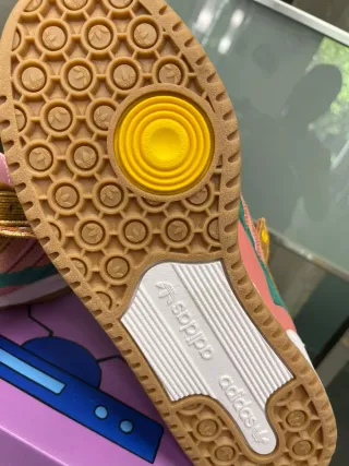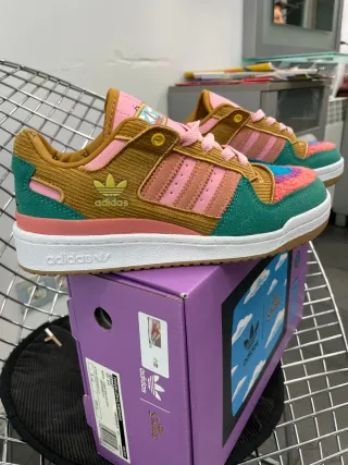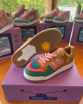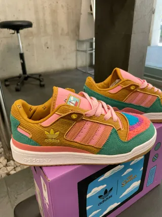 Zapatillas Adidas Forum Low inspiradas en Los Simpson. - Diseño multicolor con detalles de pana. - Cordones rosas. - Suela blanca y marrón.