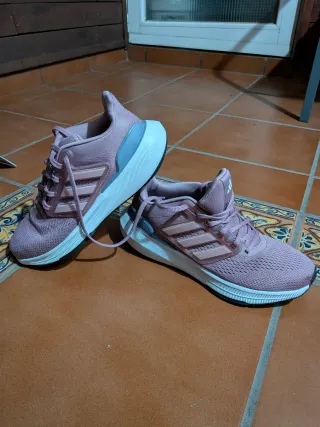 Zapatillas deportivas de la marca Adidas, diseñadas para running. Se han usado 2 veces contadas, yo necesito plantillas ortopédicas y esté modelo no me iba bien. - Color principal rosa con detalles en blanco. - Cierre con cordones. - Suela blanca.