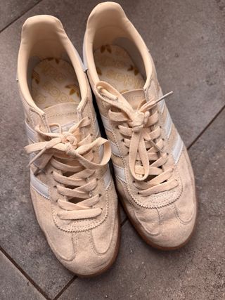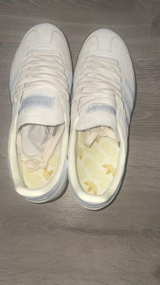 Zapatillas Adidas Handball Spezial en color blanco con detalles dorados. - Diseño clásico. - Logo de Adidas en la lengüeta. - Suela de goma. - Cordones blancos. *Usadas solo 1 dia media hora, vendo por talla pequeña.