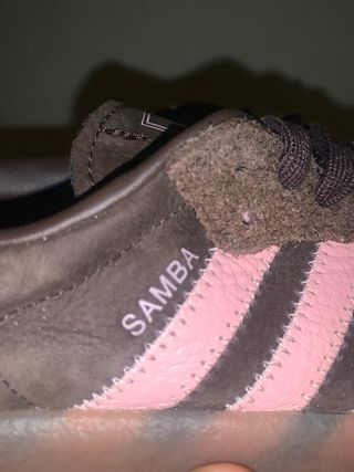 Zapatillas Adidas Samba con un diseño moderno y llamativo. - Combinación de colores marrón y rosa. - Suela de goma gruesa.