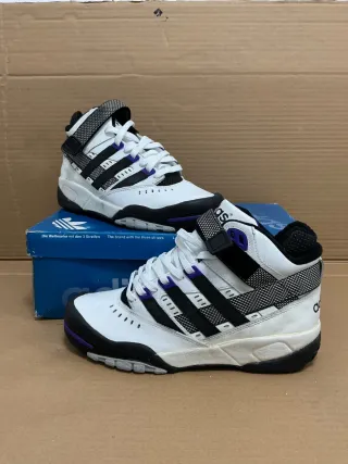 Zapatillas Adidas Streetball 1 originales del año 1992. Un modelo clásico de baloncesto que nunca ha sido usado. - Diseño de caña media. - Cierre con cordones y correa de velcro. - Detalles en color morado y negro.