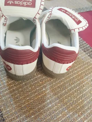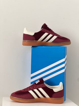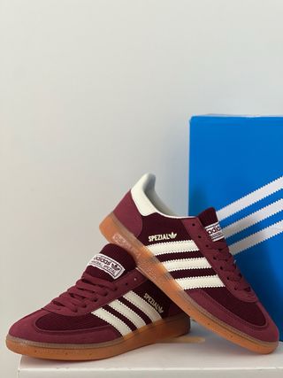 Zapatillas Adidas Handball Spezial en color granate. 🏷️ Marca / Modelo: Adidas Handball Spezial 🌈Color: Granate, Blanco. 👟 Estado: Nuevas, sin uso 📏 Talla: 40 EU 💰 Precio en tienda: 110 € 🚀 Envío: 24–36 h 📦 Incluye: Caja y envoltorio original 📋Características: - Parte superior de ante y tejido. - Suela de goma. - Detalle de las tres rayas blancas.