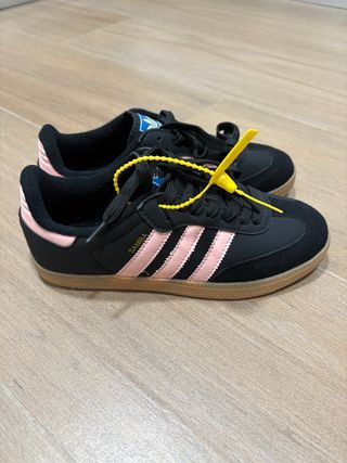 Zapatillas Adidas Samba con detalles en rosa. - Diseño clásico. - Tres rayas icónicas de Adidas. - Suela de goma. - Cierre con cordones.