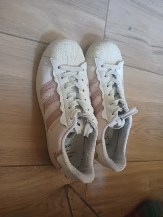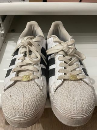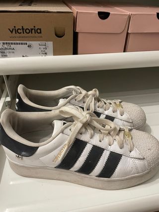 Zapatillas Adidas Superstar de hombre en color blanco con detalles en negro. Un clásico que nunca pasa de moda. - Diseño icónico con puntera de goma. - Tres rayas características de Adidas en los laterales. - Detalle de Superstar en el lateral exterior. - Logo de Adidas en el talón. Puestas en 3 ocasiones, nuevas me costaron 120€.