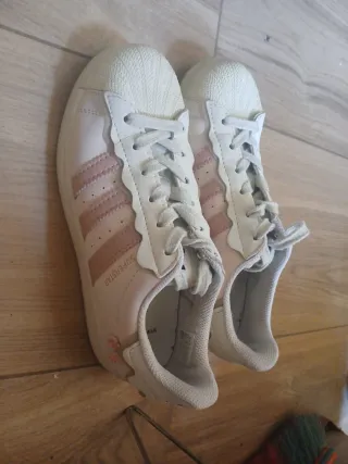 Zapatillas Adidas Superstar con un diseño clásico y detalles en rosa. - Parte superior de cuero sintético. - Cierre de cordones. - Suela de goma. - Detalle de las tres rayas icónicas de Adidas.