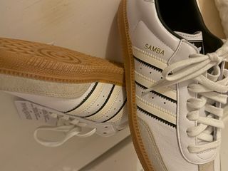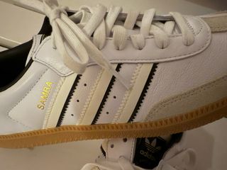 Zapatillas Adidas Samba con detalles dorados y blancos. son originales - Diseño clásico. - Suela de goma. - Logo de Adidas en la lengüeta y el talón.