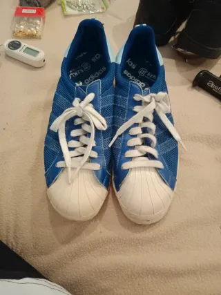 Zapatillas deportivas Adidas Superstar. - Diseño clásico con las tres franjas. - Combinación de azul y blanco. N 41 i medio