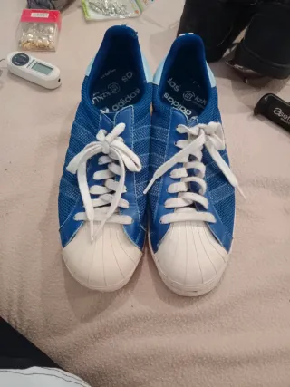 Zapatillas Adidas Superstar clásicas en talla 42. - Diseño icónico con las tres rayas. - Combinación de colores blanco y azul. - Logo de Adidas en el talón y la lengüeta.