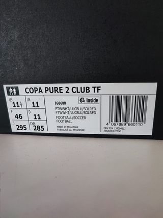 Zapatillas de fútbol Adidas Copa Pure 2 Club TF. - Modelo: IG8688 - Talla: 46 EU / 11 US - Color: Blanco con detalles en azul