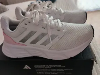 Zapatillas deportivas Adidas Galaxy 6W en color blanco. Ideales para running o uso diario. - Diseño moderno y ligero. - Cierre con cordones. - Suela de goma. - Detalles de las 3 banda puestas una vez pone 8.5 pero son son pequeñas yo diria más 7.5 casi 8 si gastas un 8 grande van justas.