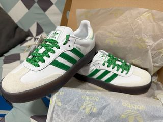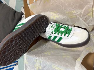 Zapatillas Adidas Samba con un diseño clásico y llamativo. son originales lleva un par extra de cordones en blanco. - Combinación de blanco y verde vibrante. - Cordones verdes a juego. - Suela de goma oscura.