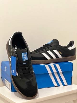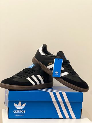 Zapatillas Adidas Samba OG en color negro. - Descripción: 🏷️ Marca / Modelo: Adidas Samba OG 👟 Estado: Nuevas, sin uso 📏 Talla: 43 EU 💰 Precio en tienda: 120 € 🚀 Envío: 24–36 h 📦 Incluye: Caja y envoltorio original 📋Características: - Detalle de las tres franjas blancas. - Suela de goma marrón. - Logo de Adidas en la lengüeta y el talón.