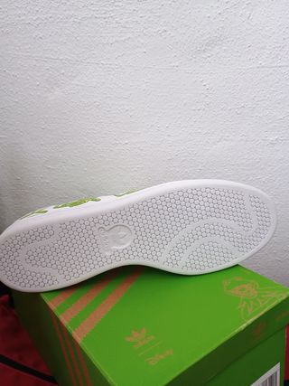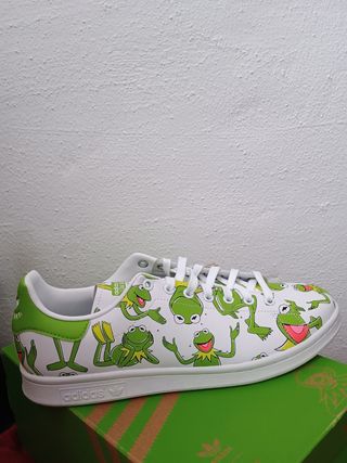 Zapatillas Adidas Stan Smith con un divertido estampado del personaje Kermit. - Diseño único con múltiples imágenes de Kermit. - Detalles en verde y blanco.