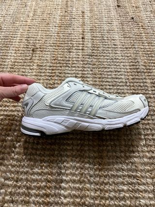 Zapatillas deportivas Adidas en tonos beige y blanco. Diseño moderno y cómodo. - Parte superior de malla transpirable. - Suela con amortiguación. - Cierre de cordones.