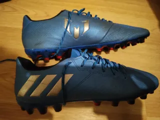Zapatillas de fútbol Adidas en tonos azules con detalles dorados.