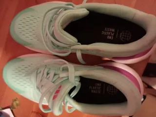 Zapatillas deportivas Adidas para mujer en color verde menta y detalles en rosa. - Diseño moderno y ligero. - Suela con tecnología End Plastic Waste. - Talla 38.