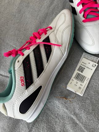 Zapatillas de fútbol sala con un diseño moderno y llamativo.Usadas en una ocasion - Exterior blanco con detalles en azul marino y toques rosas. - Cordones de color rosa vibrante. - Suela de goma para un buen agarre.