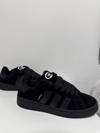 Zapatillas Adidas Campus de ante negro con detalles blancos. - Diseño clásico de tres rayas. - Suela de goma. - Cierre con cordones blancos.