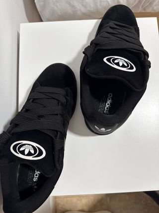Zapatillas Adidas Campus en color negro y blanco, talla 42. - Diseño clásico con las tres rayas. - Detalle de la palabra CAMPUS en el lateral. - Suela de goma. - Cordones blancos.