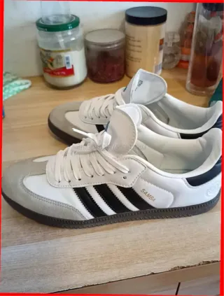 Zapatillas Adidas Samba clásicas en talla 36. Un diseño icónico que combina estilo y comodidad. - Parte superior de cuero blanco y ante gris. - Tres rayas negras características de Adidas. - Detalle SAMBA en dorado.