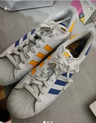 Zapatillas Adidas Superstar en talla 46. Un clásico para tu día a día. - Diseño icónico con las tres franjas. - Cierre con cordones. - Punta reforzada. - Detalle de color azul y amarillo en las franjas.