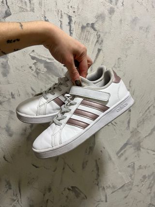 Zapatillas deportivas Adidas Grand Court. - Talla 35. - Diseño en color blanco con detalles en cobre. - Cierre de velcro y cordones.