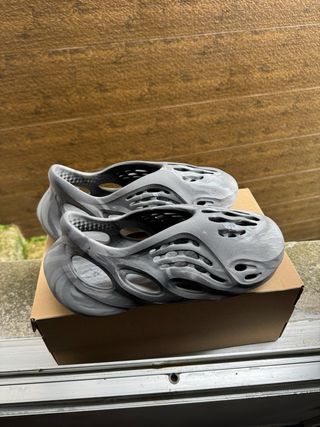 Zapatillas Adidas de color gris con un diseño moderno y único. - Material de espuma. - Estilo futurista. - Aberturas para ventilación.