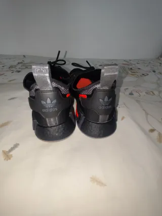 Zapatillas Adidas NMD R1 ATA en talla 45 1/3. - Diseño moderno en negro con detalles naranjas. - Cierre de cordones. - Suela con tecnología Boost. - Muy cuidadas con pequeño roce zapatilla izquierda