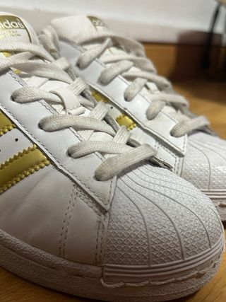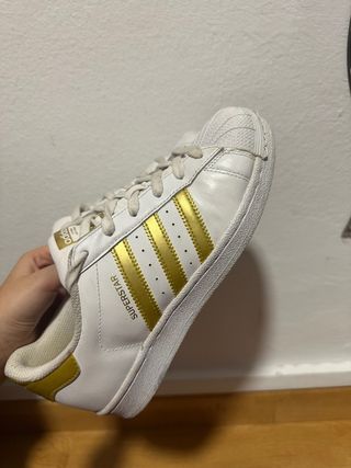 Zapatillas Adidas Superstar con un diseño clásico y llamativo. - Combinación de blanco y detalles dorados. - Logo de Superstar en el lateral.