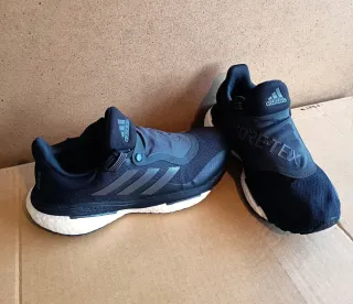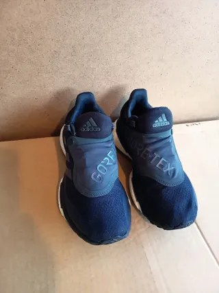 Zapatillas deportivas Adidas Solar Glide 5 con tecnología Gore-Tex. Tala 36 2/3 Se han puesto 2 veces para probarlos,con tan mala suerte de enganchar con un alambre y romper un poquito la tela por un lateral. Se puede coser sin problema. Las zapatillas están impecables,las plantillas sin tocar,por qué se pusieron unas hechas a medida,de ahí la venta,no encajaban bien. Costaron 80 euros