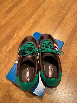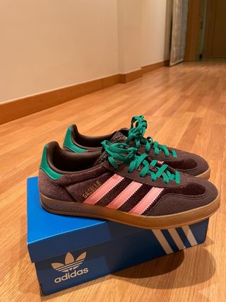 Zapatillas Adidas Gazelle con un diseño llamativo. - Combinación de colores marrón y rosa. - Cordones verdes. - Suela de goma. - Logo de Adidas en la caja. - Talla 36 2/3