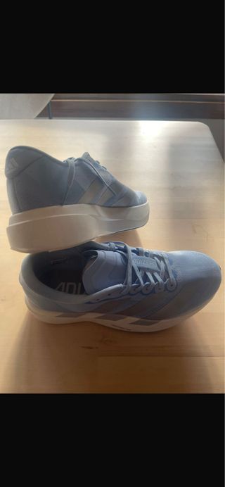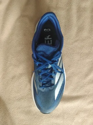 Se vende SOLO Zapatilla Izquierda. Deportivas Adidas Adizero en talla 44. Diseñadas con la tecnología Lightstrike Pro para un rendimiento óptimo. - Color azul con detalles plateados. - Cierre de cordones. - Suela blanca.