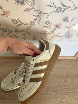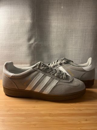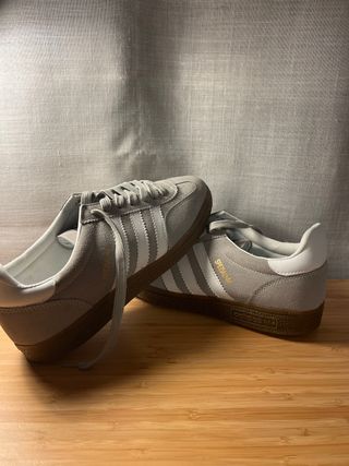 Zapatillas Adidas Spezial en color gris y blanco. Un clásico con suela de goma. Zapato muy cómodo y multiusos sin estrenar. La talla es un 43-44 - Diseño icónico de Adidas. - Tres rayas laterales en blanco. - Detalle Spezial dorado en el lateral. - Suela de goma marrón. Precio negociable.