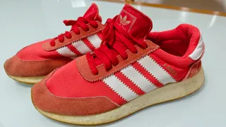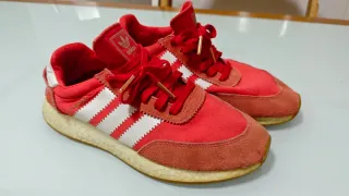 Zapatillas Adidas I-5923 (Iniki) en color rojo y rayas blancas. Talla 41 1/3 (Talla 8 americana)