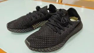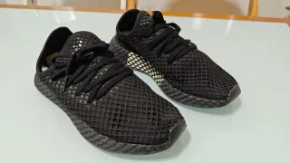 Zapatillas Adidas Deerupt en color negro con detalle blanco en el borde interior de la suela. Talla 41 1/3 (Talla 8 americana)