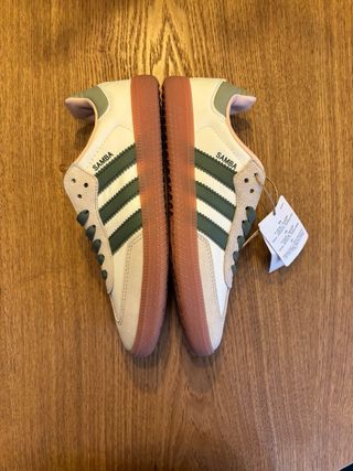 Zapatillas Adidas Samba con un diseño clásico y moderno. - Combinación de colores beige y verde. - Suela de goma. - Detalle de las tres rayas icónicas de Adidas.