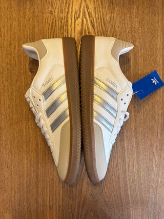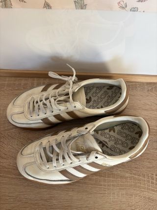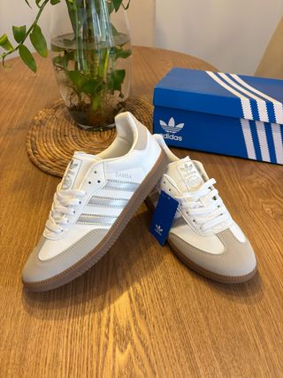 Zapatillas Adidas Samba en tonos beige y blanco. Un clásico atemporal para tu día a día. - Diseño icónico de Adidas. - Suela de goma. - Cordones blancos.