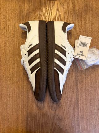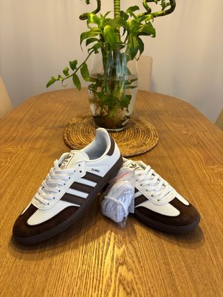 Zapatillas Adidas Samba con un diseño clásico y atemporal. - Combinación de colores blanco y marrón. - Detalle de las tres franjas. - Logo de Adidas en la lengüeta.