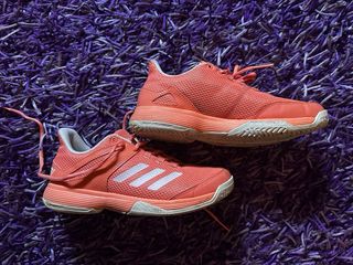 Zapatillas deportivas Adidas con un diseño moderno y detalles llamativos. Pongo talla 38 porque es la que yo uso y me sirve (la etiqueta pone 37 1/3) -Usadas siempre en polideportivo. - Parte superior de malla transpirable. - Detalles en color verde y naranja.