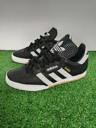 Zapatillas Adidas Samba clásicas en color negro con detalles blancos. Perfectas para el día a día. - Diseño icónico de Adidas. - Tres rayas blancas laterales. - Logo de Adidas en la lengüeta y el talón.