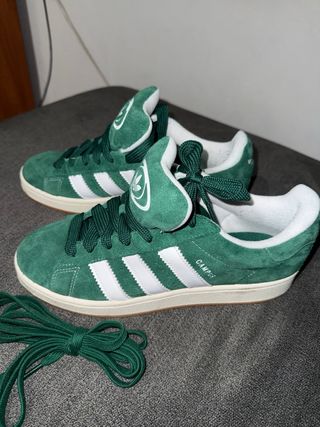 Zapatillas Adidas Campus en color verde y blanco. - Exterior de ante. - Detalle de las tres rayas blancas. - Suela de goma.