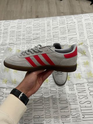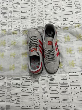 Zapatillas Adidas Spezial en color gris con detalles en rojo. Un clásico para el día a día. - Diseño deportivo. - Tres rayas icónicas de Adidas.