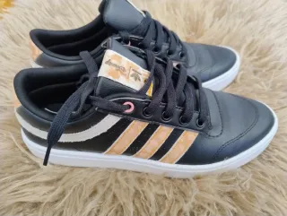 Zapatillas Adidas edición especial Disney con diseño de Bambi. - Combinación de colores negro y naranja. - Detalle de las icónicas tres rayas de Adidas. - Estampado de Bambi en la lengüeta y talón. - Talla 39 un tercio