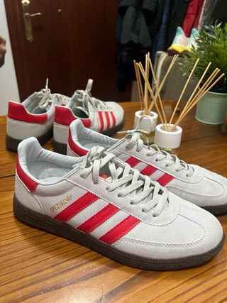Zapatillas Adidas Spezial unisex. - Diseño clásico con las tres rayas. - Combinación de colores blanco y rojo. - Suela de goma adherente.