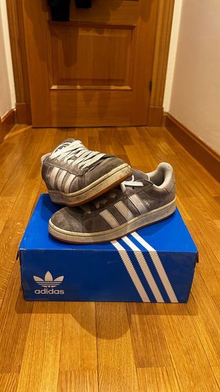Zapatillas Adidas Campus en color gris con detalles blancos. Un clásico para el día a día. - Diseño icónico de tres rayas. - Detalle de la palabra CAMPUS en el lateral.