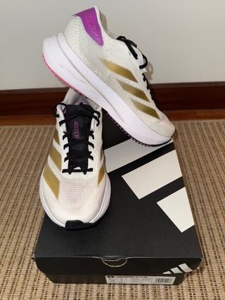 Adidas Adizero SL2 W, en blanco y dorado,talla 6 1/2 - 38, las vendo con solo dos usos porque me han regalado otras. Están prácticamente nuevas. - Detalle en color púrpura en el talón. - Suela con detalles en rosa.
