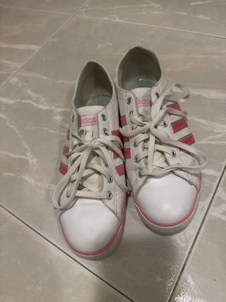Zapatillas de lona Adidas modelo Nizza en color rosa: - Cierre de cordones. - Detalle de las tres rayas en contraste. - Suela de goma vulcanizada. A estrenar (vendo porque me están pequeñas); en perfecto estado !!