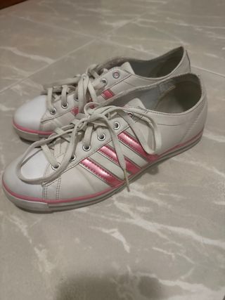 Tenis casuales de la marca Adidas, con un diseño moderno y cómodo. - Combinación de colores blanco y rosa. - Cierre de cordones para un ajuste seguro. - Detalle de las tres franjas icónicas de Adidas. En condiciones aceptables ya que habría que meter unas plantillas