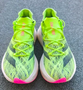 Zapatillas Adidas Adizero Prime X 2 Strung en llamativos tonos verdes y detalles en rosa. - Zapatillas altas gama "Adidas adizero prime X 2 strung) originales,muy poquito usadas, prácticamente nuevas,sin desperfectos,la caja la tiré( no tenía pensado venderlas) - Diseño moderno y deportivo. - Tejido transpirable. - Suela con amortiguación.